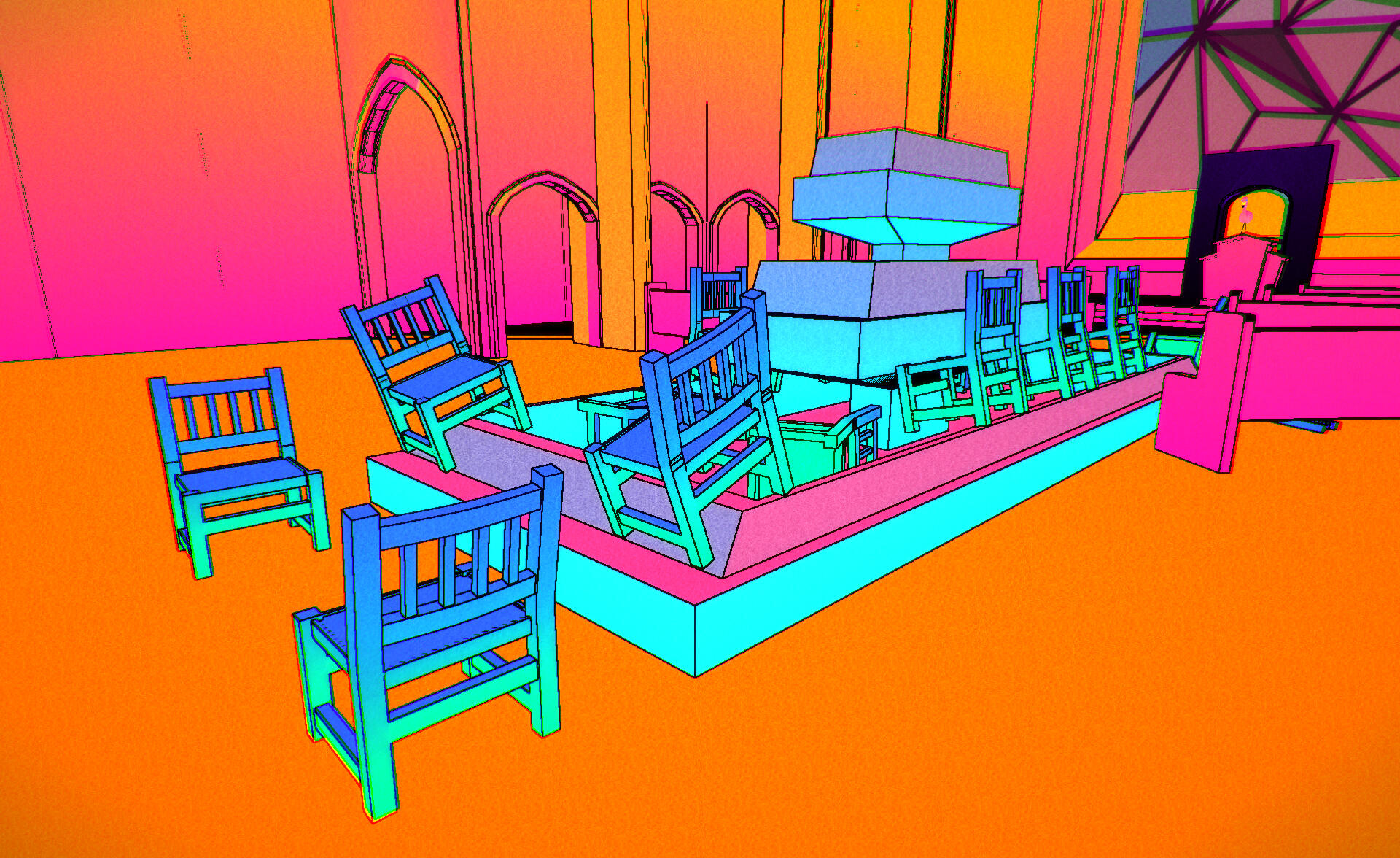 Picture a 3D first-person mobile game where you wander around an exact scale recreation of some hallways, classrooms, and a computer lab in the ground floor of a college building in downtown Chicago. Questgiver NPCs are represented as crudely magic-wanded photographs of teachers and employees that swap out depending on your angle of approach, so that you see a different image depending on whether you are viewing them from the side, back, front, etc. I have no idea why this technique isn’t more common, it was great. I wish I had at least saved a gif. I’d have students and staff stand in the middle of an occult-looking pattern of tape on the floor of the equipment cave and stay still while I photographed them from probably over a dozen angles.