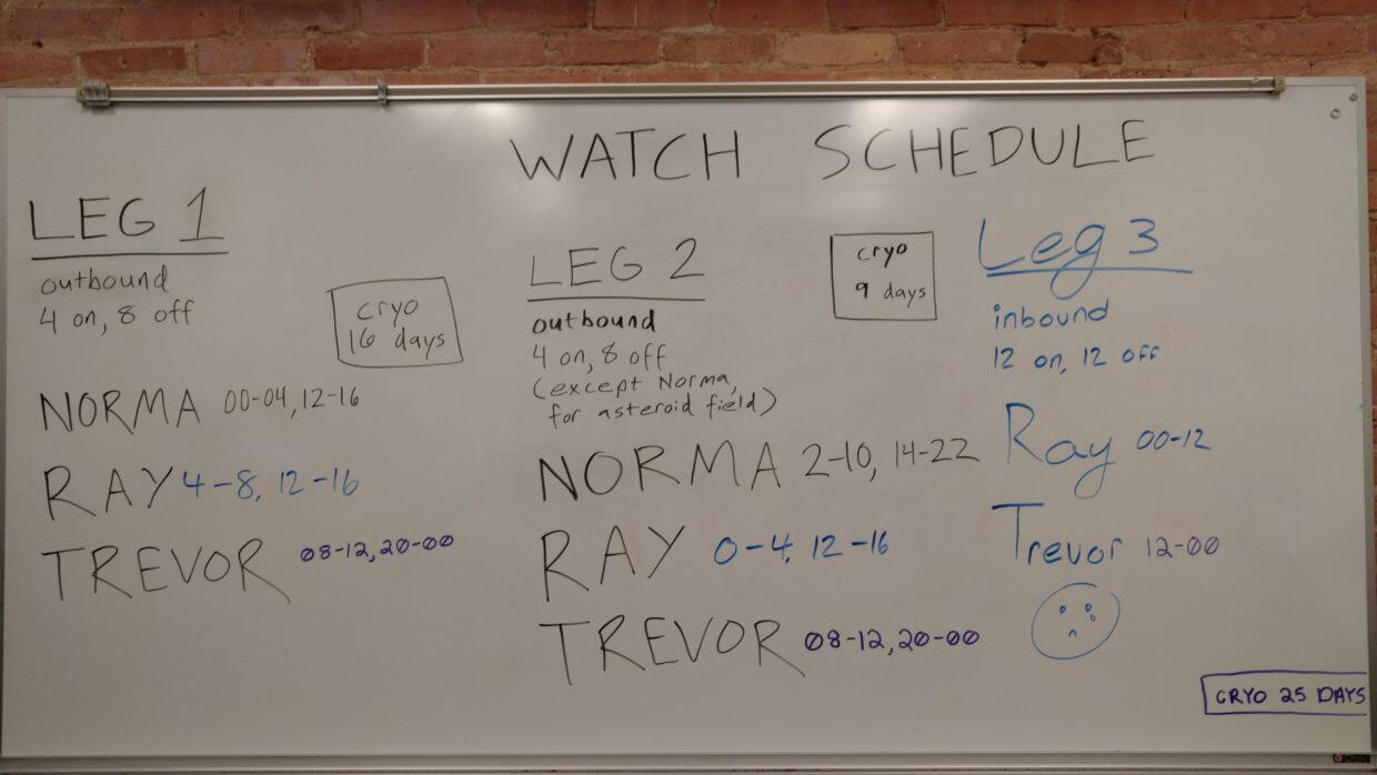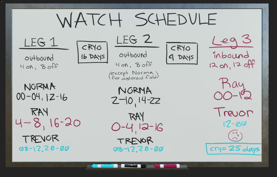 Since the game’s concept relies so heavily on player investment in believable, relatable characters, I wanted to fill the ship with props to help tell their story, like this whiteboard. I tried to give all three characters very distinctive handwriting.