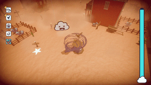 Dust Devil Crossroads level, specifically the cow physics, weathervane physics, hat gag, tumbleweed gag, "do not rain" objective, and the name "Dust Devil Crossroads"