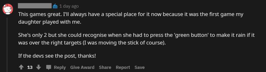 Generally, this was a super enjoyable game to work on. I like coming up with stuff, I like building stuff from the ground up, I like close-knit collaboration, I like Jazzpunk-style sight gags and easter eggs, I like variety, I like highly tactile gameplay. A lot of those preferences really crystallized in a more meaningful way for me while I was on Rain on Your Parade. Part-time work has its drawbacks—not enough money on its own, not enough free time otherwise—and the game was definitely a stylistic departure from my usual work, as well as Jakub’s, but damned if it doesn’t feel good to see stuff like this in my notifications: