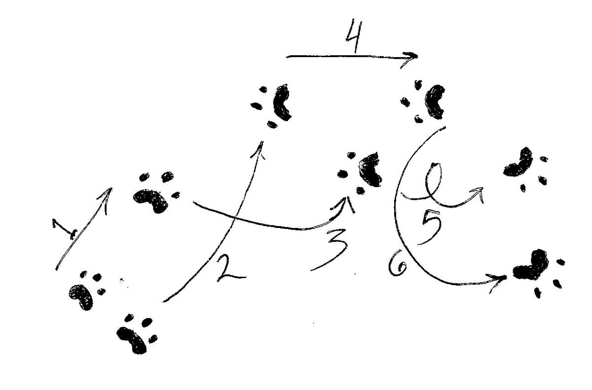 Dog silhouettes resemble fast-moving bugs, angular lines mixed with arcing curves