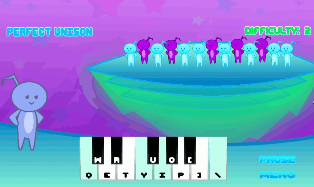 In this one, player input is a MIDI keyboard (ignore the QWERTY overlay in the gif, that just appears as an input fallback). You make little aliens jump up and down and their islands move closer together when you play the correct melody. It was made as part of a summer challenge to teach little kids pattern recognition.