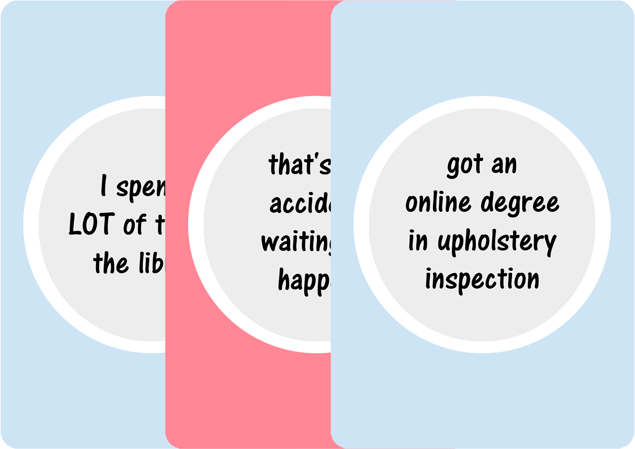 Another assignment, this one for an interactive narrative class. We were instructed to make a story about someone with the power of psychometry—getting psychic information from touching an object (yes, same class and assignment as mentioned above in the Narrative Interlude). I made mine about my sister’s bookshelf, since we were roommates at the time and I liked perusing it while feeding her cat when she was at work. I made a story branch for every single book on her shelf (more than 40), and every branch is a real memory associated with that particular book.