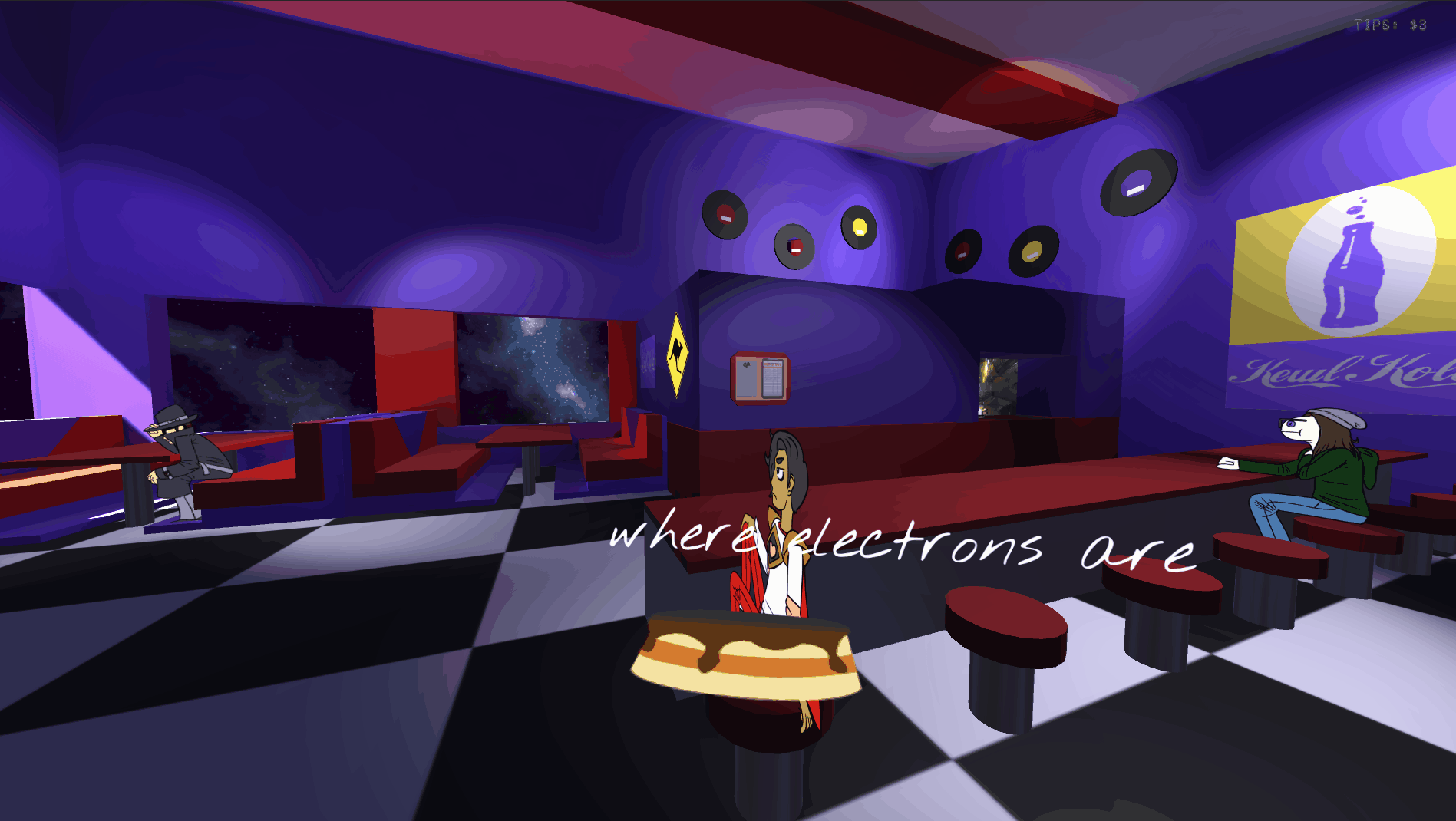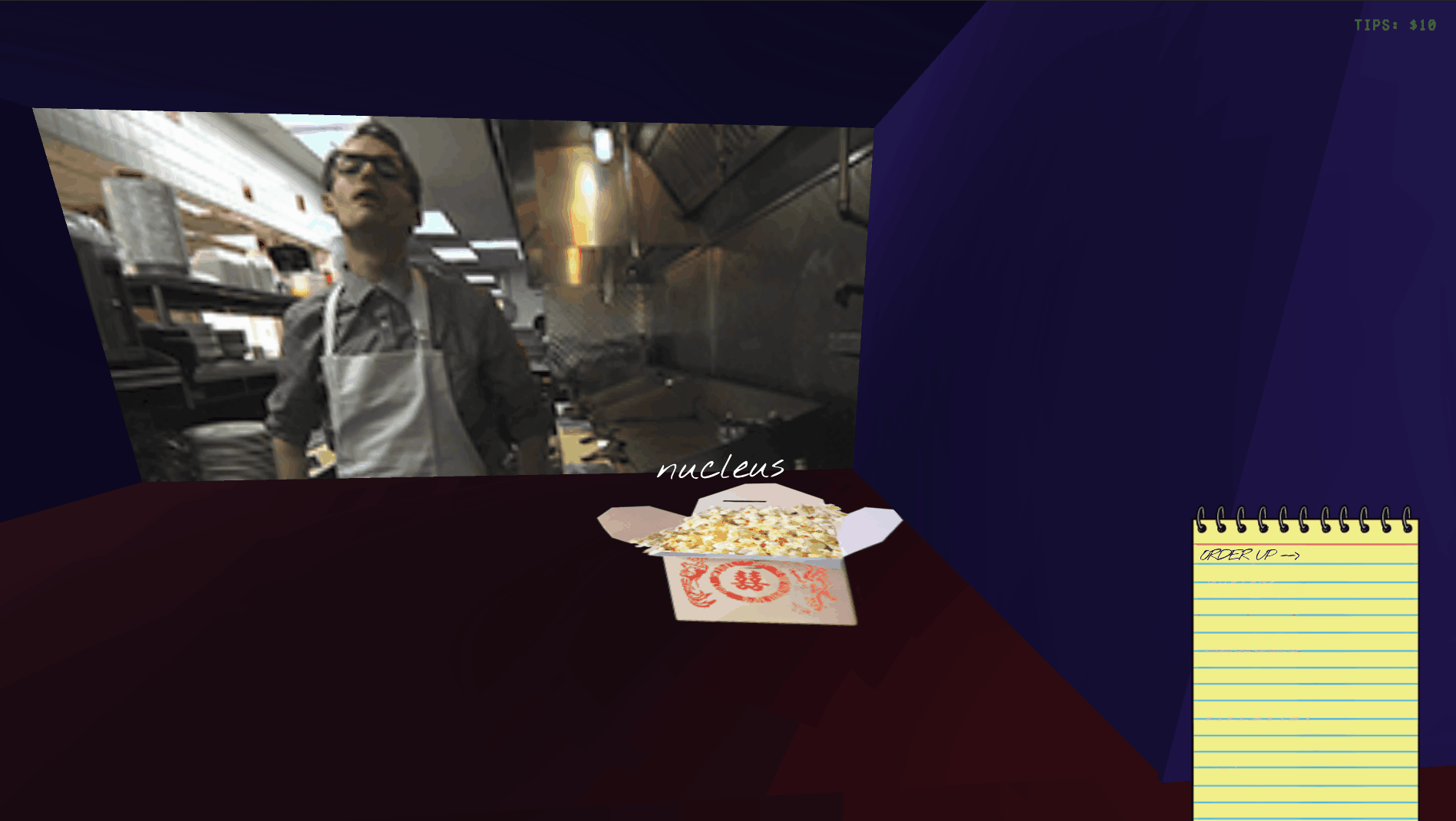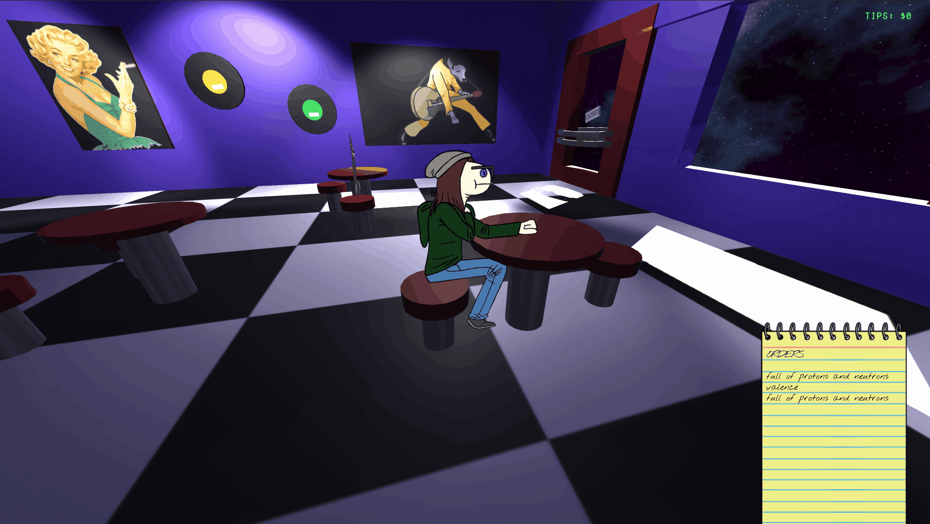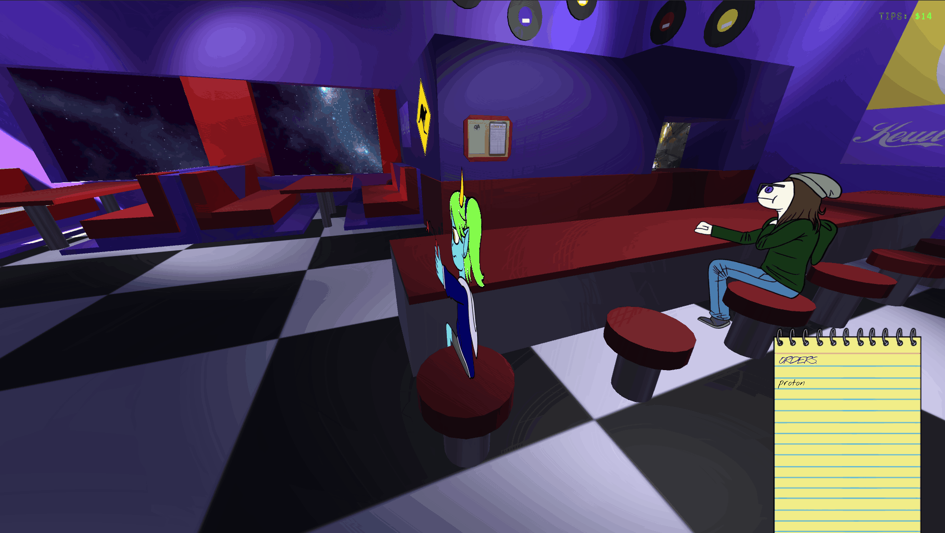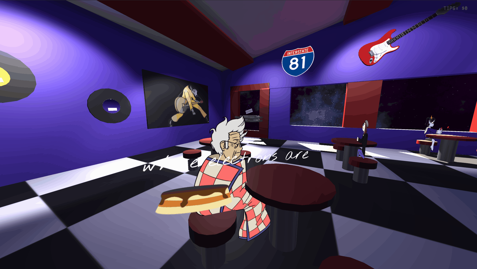 Looking at the old gifs, I recognize the customers: shifty sleuth, nervous alien girl, cozy old guy, boy band superhero heart-throb, and our professor as a sock puppet. The footage is of our environment artist/designer, Bob, in the kitchen of a surprisingly accommodating diner in south Chicago.