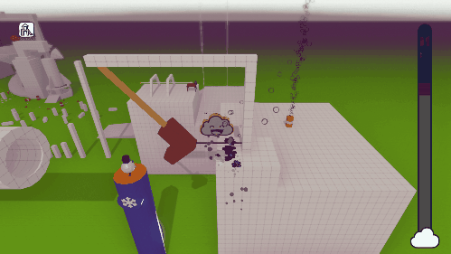 This means that after concepting an idea for a new level, building it is mostly a matter of putting together the basic layout, populating the space with wettables, flammables, physics objects, etc., and programming any new, special stuff not accounted for by those systems—for example, an alien spaceship that flies away when its little green pilot is led back to it, or a bunch of gardening tools that need to be hidden under snow before grandpa finds them.